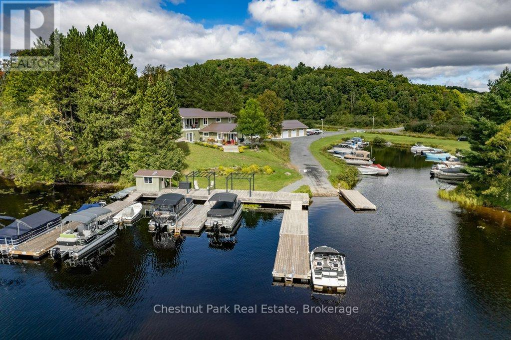 Live, Work and Play on this Commercially Zoned 5+ Acre Property situated on the popular Shores of Lake Vernon. This 5 Bedroom, 2 Bathroom year round home or cottage offers South West views and access to miles of boating on Vernon, Mary, Fairy and Peninsula. Less than 20 minutes to downtown Huntsville by car or by boat where you will find great shopping, restaurants, events and attractions. The property is zoned CS4 (Marina) which would allow for a multitude of uses including but not limited to a fully functional Marina, Outdoor Storage, Restaurants and Retail. The owner currently rents out 36 boat slips per season. The lower walkout level boasts a large living area, kitchen, dining space, bathroom and bedroom. Upper level is complete with 4 additional Bedrooms, a 4 piece Bathroom and a newly built Muskoka Room completed in 2017 with beautiful pine walls and a glass rail deck system providing spectacular lake views. Decks, patios and a stone fire pit area offer many outdoor areas to entertain friends and family. A bunkie at Lakeside offers additional sleeping and storage. 8-10 feet of clear water at end of main dock. The 3 Bay newly built 2000 square foot Garage is every car and toy enthusiasts dream with in-floor heating and tons of space for vehicles, a workshop or entertaining. The owner has created a large parking area for boat slip rental guests and remaining acreage is flat, maintained and ready for future development. Multitude of Commercial Uses. (id:6289)