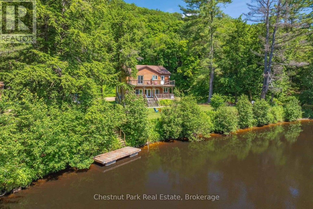 Tucked away at the very end of quiet Bridgeview Lane, this rare and private 4-acre retreat offers 600 feet of pristine frontage on the Big East River, a truly a one-of-a-kind waterfront getaway. This exceptional property includes two fully winterized, four-season homes or cottages. The main cottage, newly completed in 2015 from the foundation up, offers 4 bright and spacious bedrooms, 3 bathrooms, and approx. 2,300 sq ft of finished living space. Enjoy serene morning coffee or sunset views from the upper-level sundeck off the primary bedroom, and cozy evenings on the covered lower porch surrounded by whispering pines and starry skies. The second cottage, completely renovated in 2019, is a charming 1 bedroom & 1 - 4pc bath + loft hideaway offering over 700 sq ft of cozy, efficient living space ideal for guests, family, or rental income. Both dwellings are equipped with modern heating/cooling (propane furnace & central A/C in the main, heat pump in the second), wood stoves for ambiance, and separate septic and hydro systems. The expansive shoreline features deep water off the dock for boating and a gentle sandy beach entry perfect for swimming. With only five cottages on the entire lane and this being the last, total seclusion is yours to enjoy. Just a 10-minute boat ride takes you into Lake Vernon and access to over 40 miles of boating through Huntsvilles three-lake chain, including direct entry to downtown. All town amenities are just a quick 5 minutes drive away. Whether you're dreaming of a peaceful family compound, or a peaceful retreat with room to grow, this property checks many boxes. Bright, airy, and filled with Muskoka charm. This property is best experienced in person! Don't miss this incredible opportunity in the heart of Cottage Country. (id:6289)